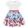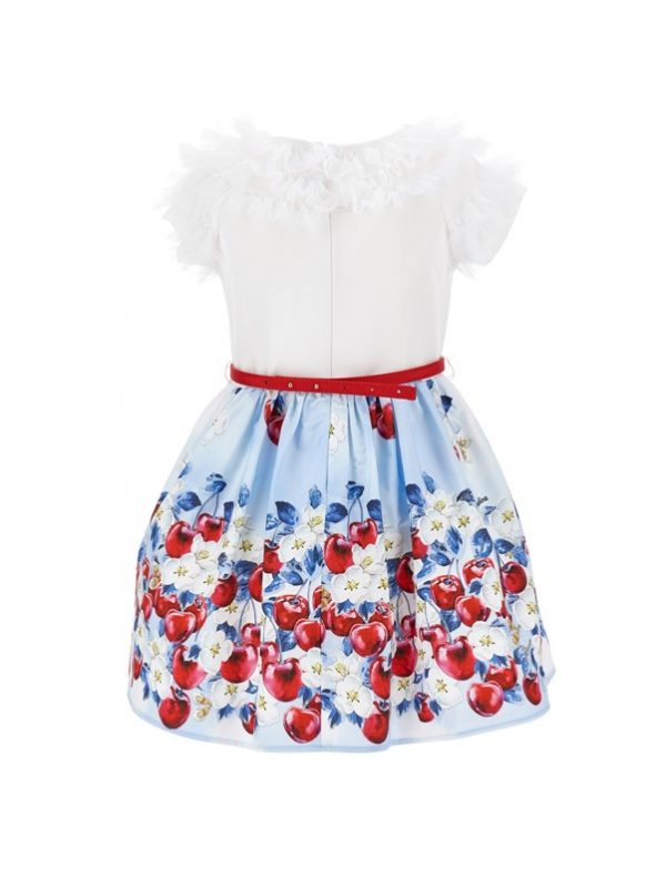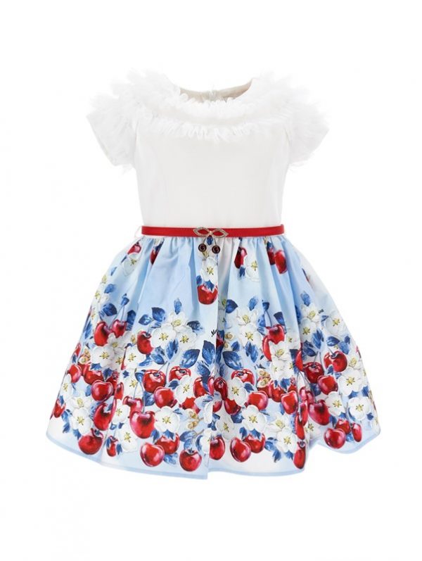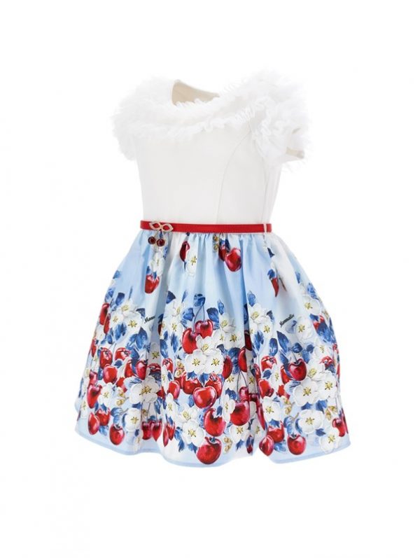 Sofisticato abito in mikado stampato con maxirose, CERIMONIA BAMBINE E RAGAZZE mikado stampato fiori maniche tulipano arricciatura in vita e cintura con fiocco e strass fodera in mussola e tulle