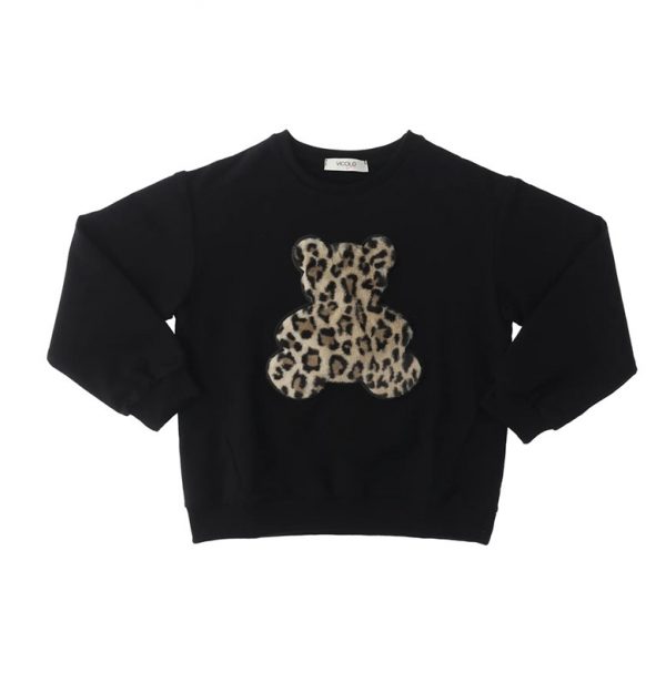 Felpa girocollo a maniche lunghe bordi a costine polsini elasticizzati interno felpato figura in tessuto effetto peluche e scritta logo in strass sul davanti